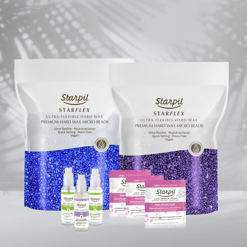Our StarFLEX Bundle combines waxing results with antioxidants, moisture, and hydration for skin for ultra-smooth results. Pair our new limited edition StarFLEX Blue & Malva Hard Waxes with our Pre & Post-Wax Care lineup and Jelly Mask to leave skin glowing. Get ultra-smooth skin with this all-star lineup—only for a limited time!